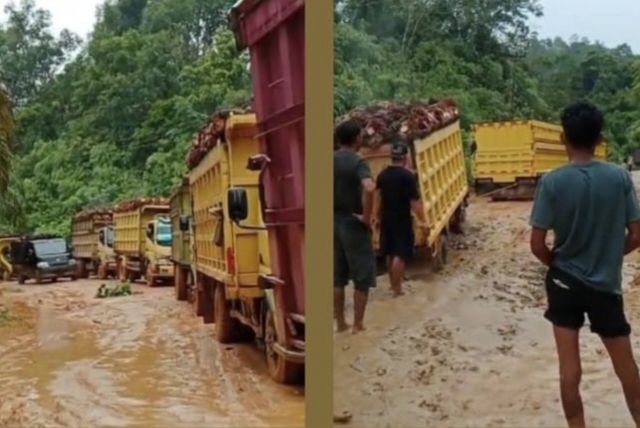 “Tiap hari truk mengangkut buah sawit dengan melebihi batas kekuatan jalan sehingga jalan ini cepat rusak. Kalau dah macam gini masyakat juga yang susah, mau lewat pun payah, tolonglah pihak berwenang agar ini ditertibkan, ” ujar warga yang tak mau nama nya disebutkan.